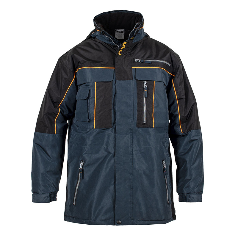 Veste de travail VITO SECURITY 100% Polyester avec revêtement en PVC. Taille XL. Bleu et noir. Imperméable. Conçue pour les travaux en extérieur en hiver (basses températures). Ceinture élastique. Fermeture éclair avec rabat à scratch. Quatre poches avec fermeture éclair. Trois poches avec rabat de serrage à scratch. Capuche amovible avec la doublure en polaire. Col avec une doublure en polaire.